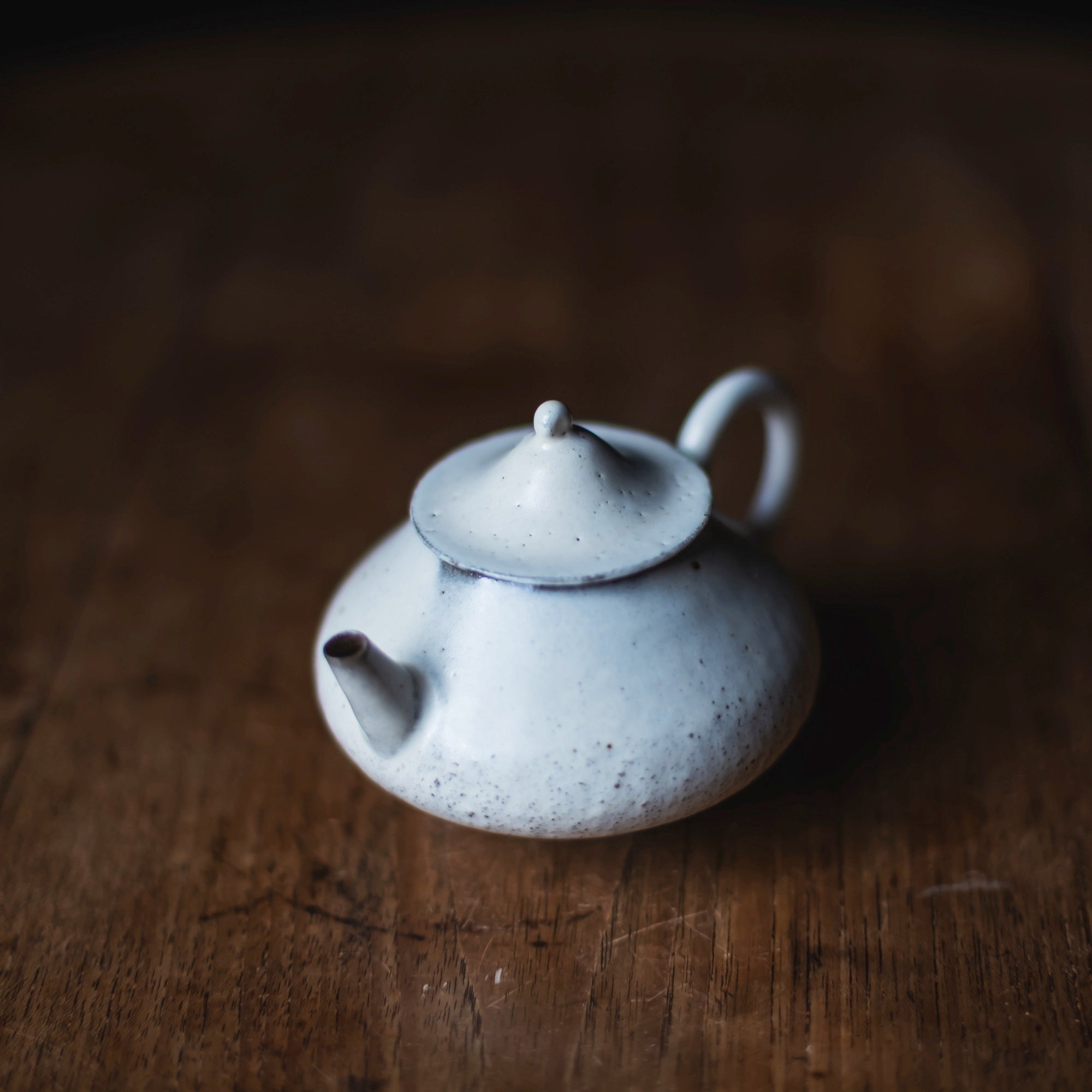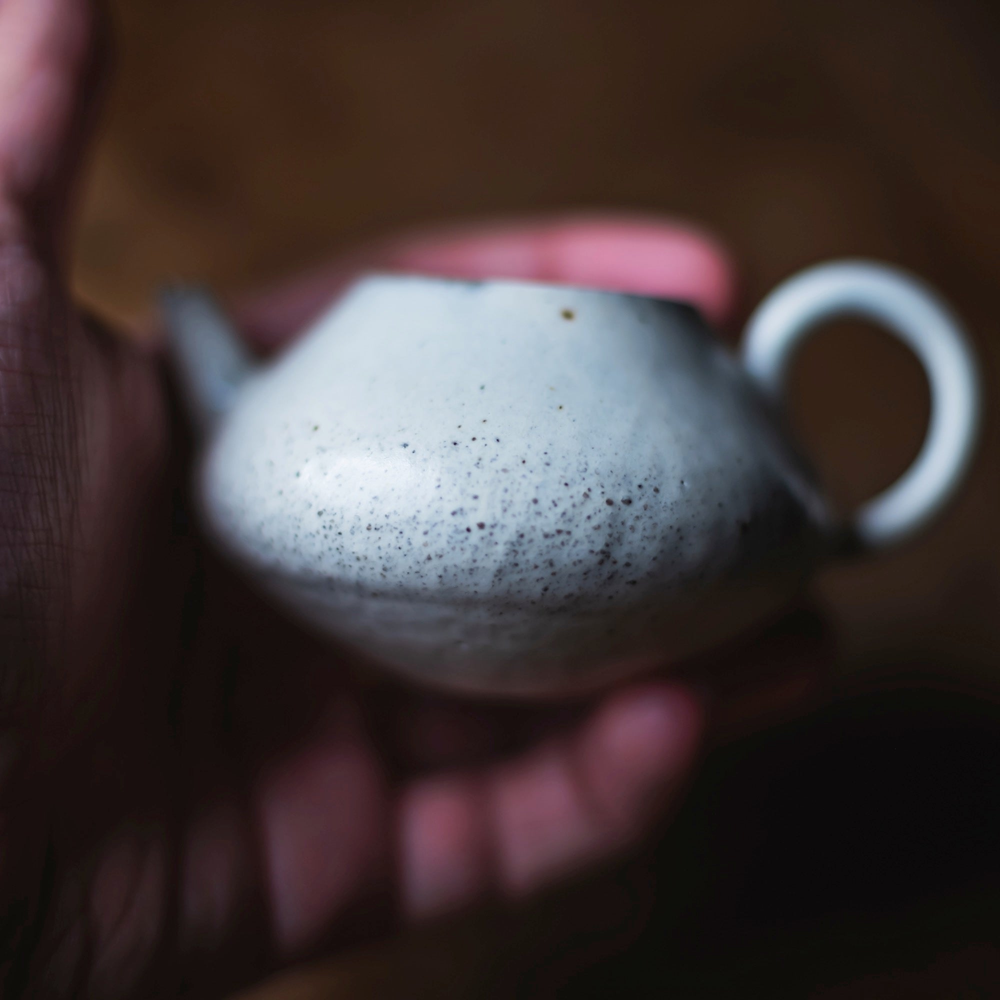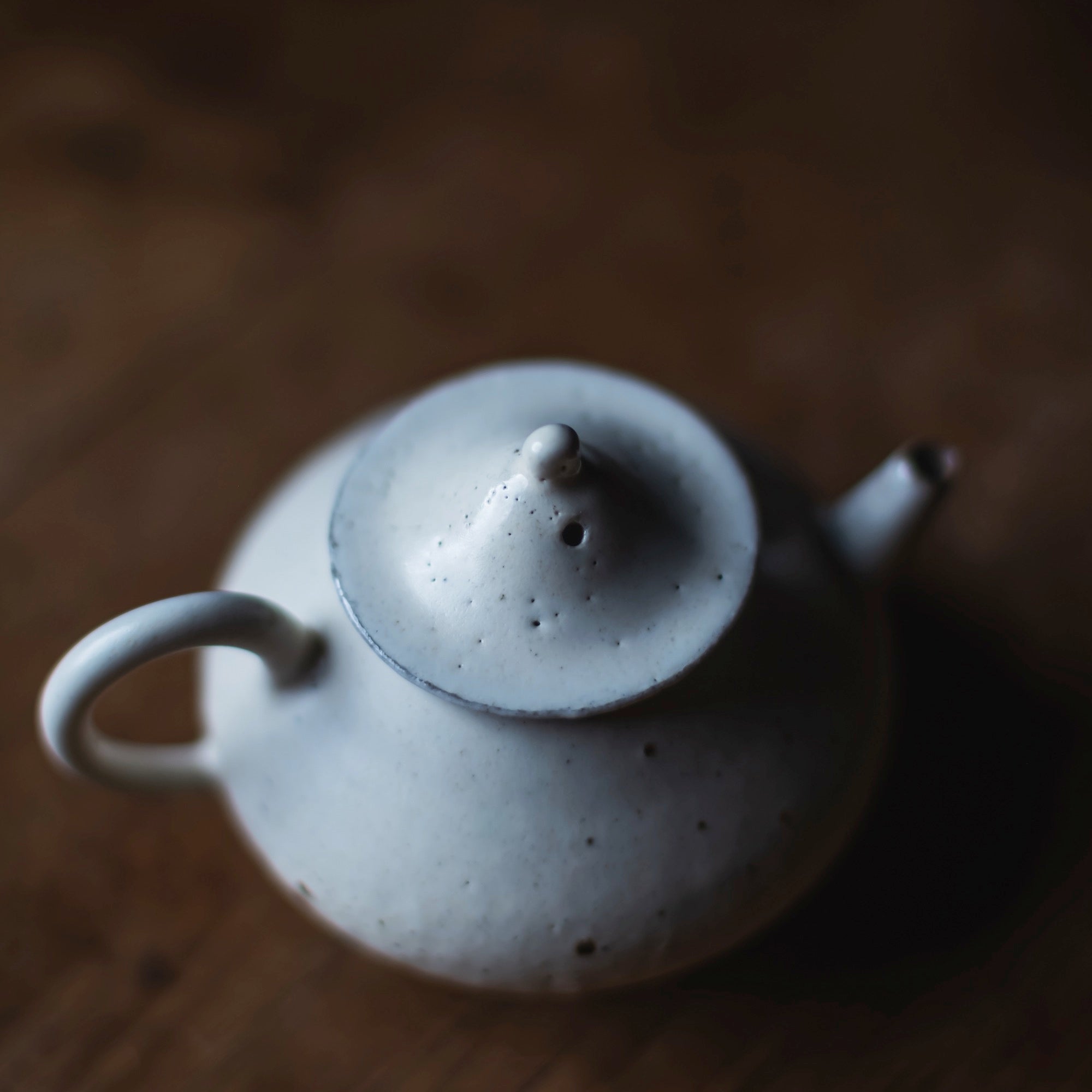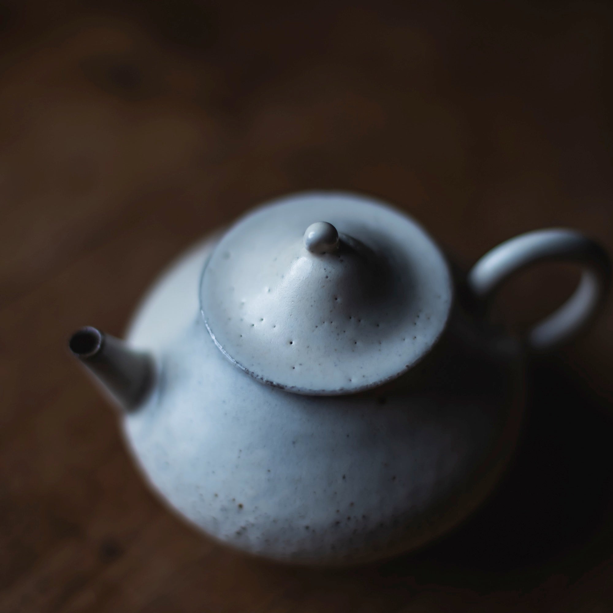 Back-Handle Teapot, wild clay, glazed outside, single hole filter equipped with removable metal mesh.
