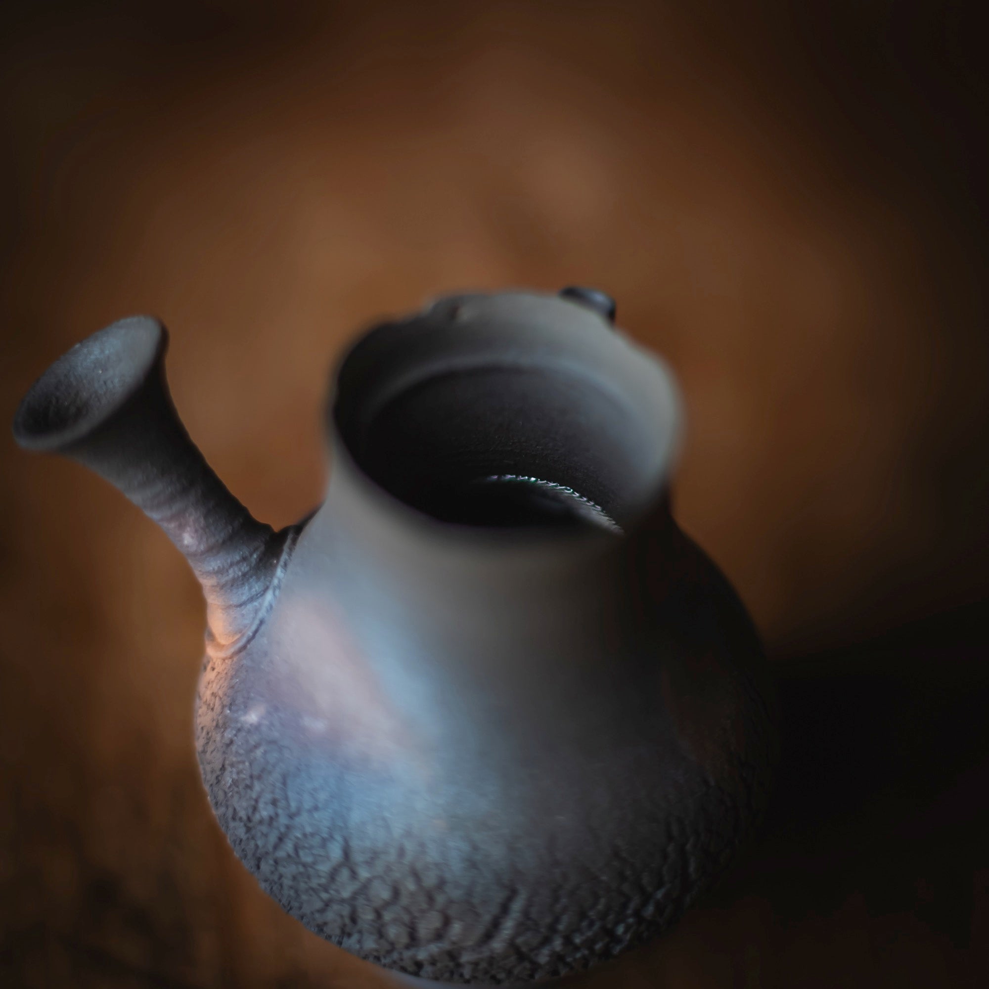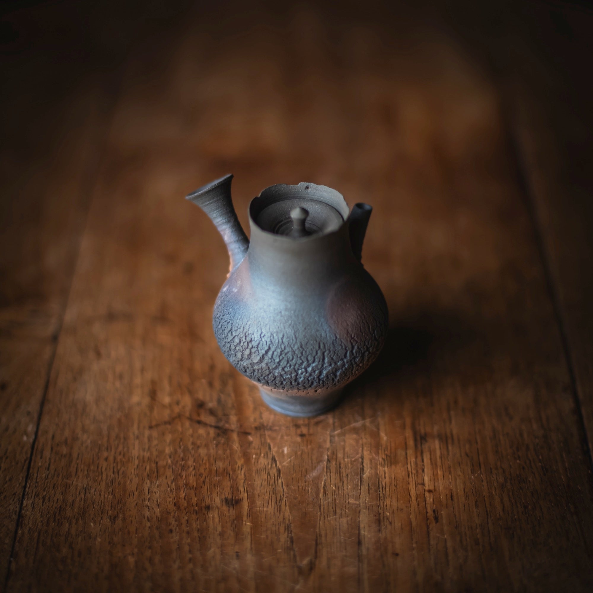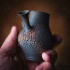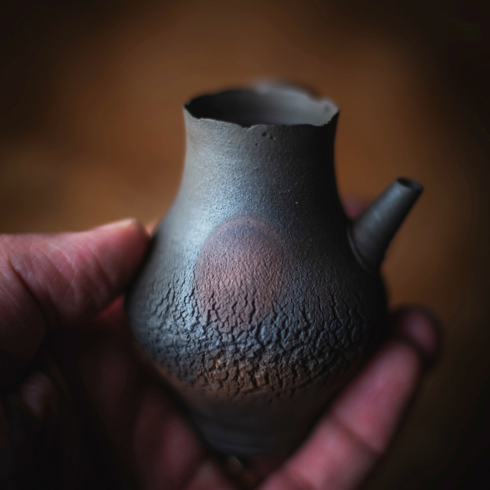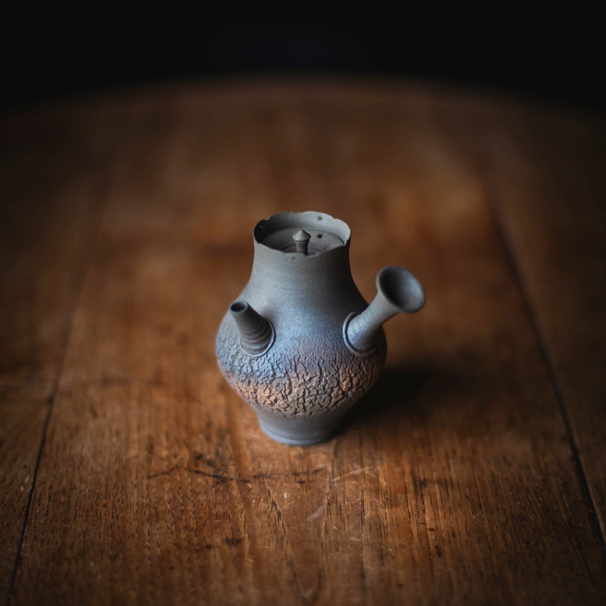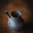 Side-Handle Teapot, wood-fired wild clay, unglazed, single hole filter equipped with removable metal mesh.