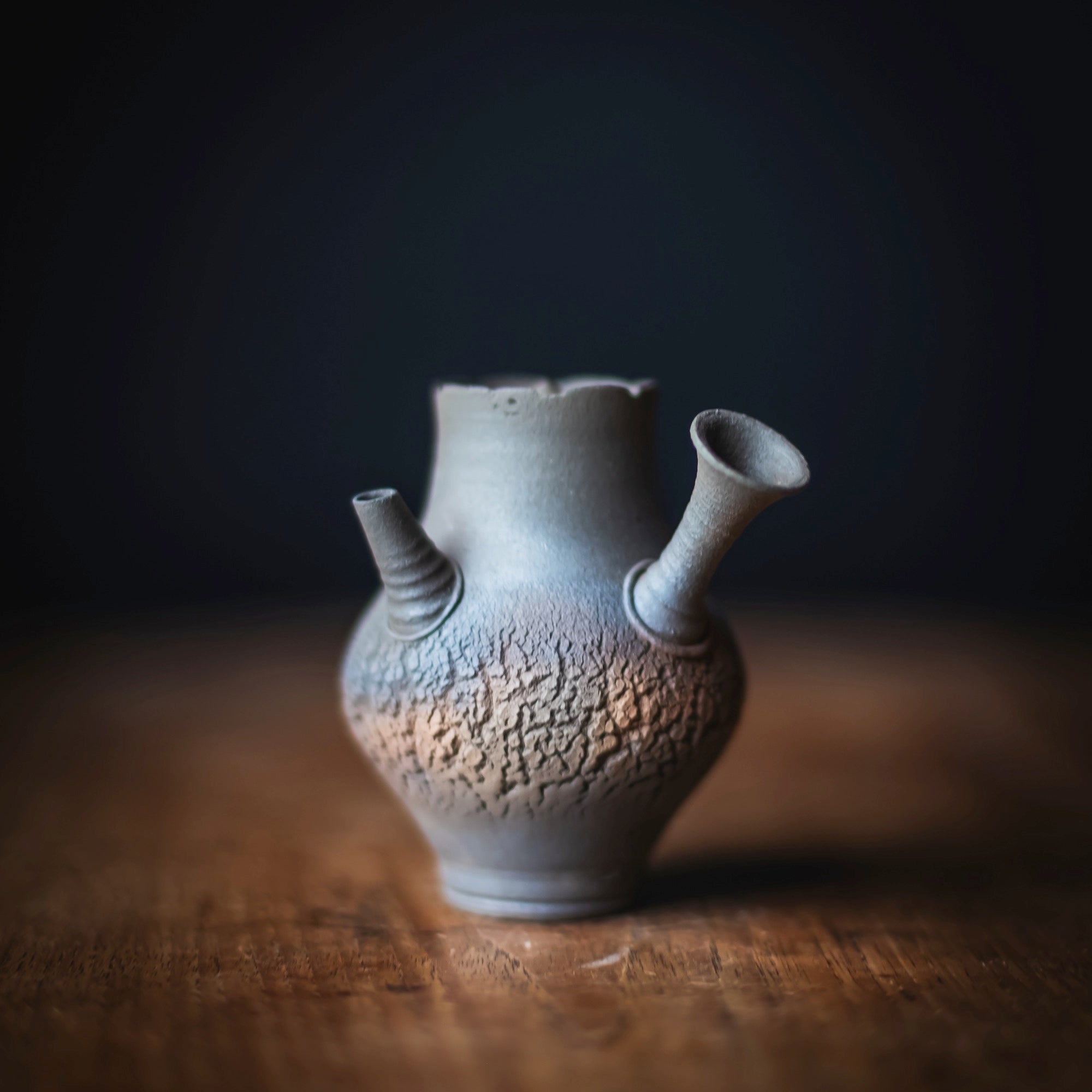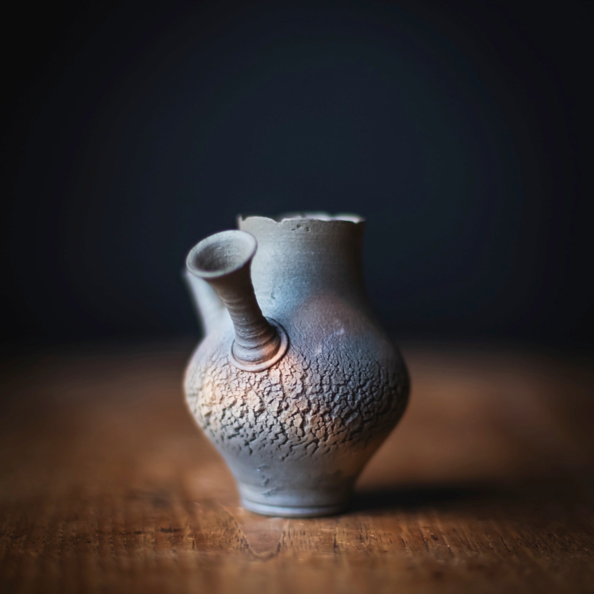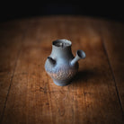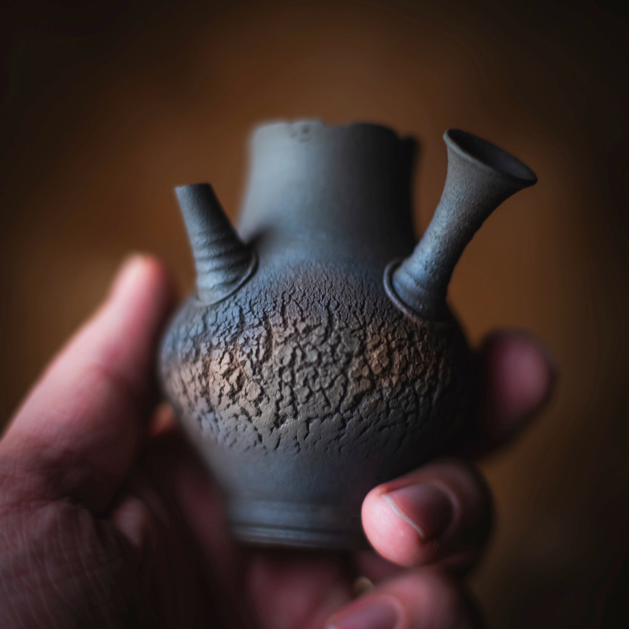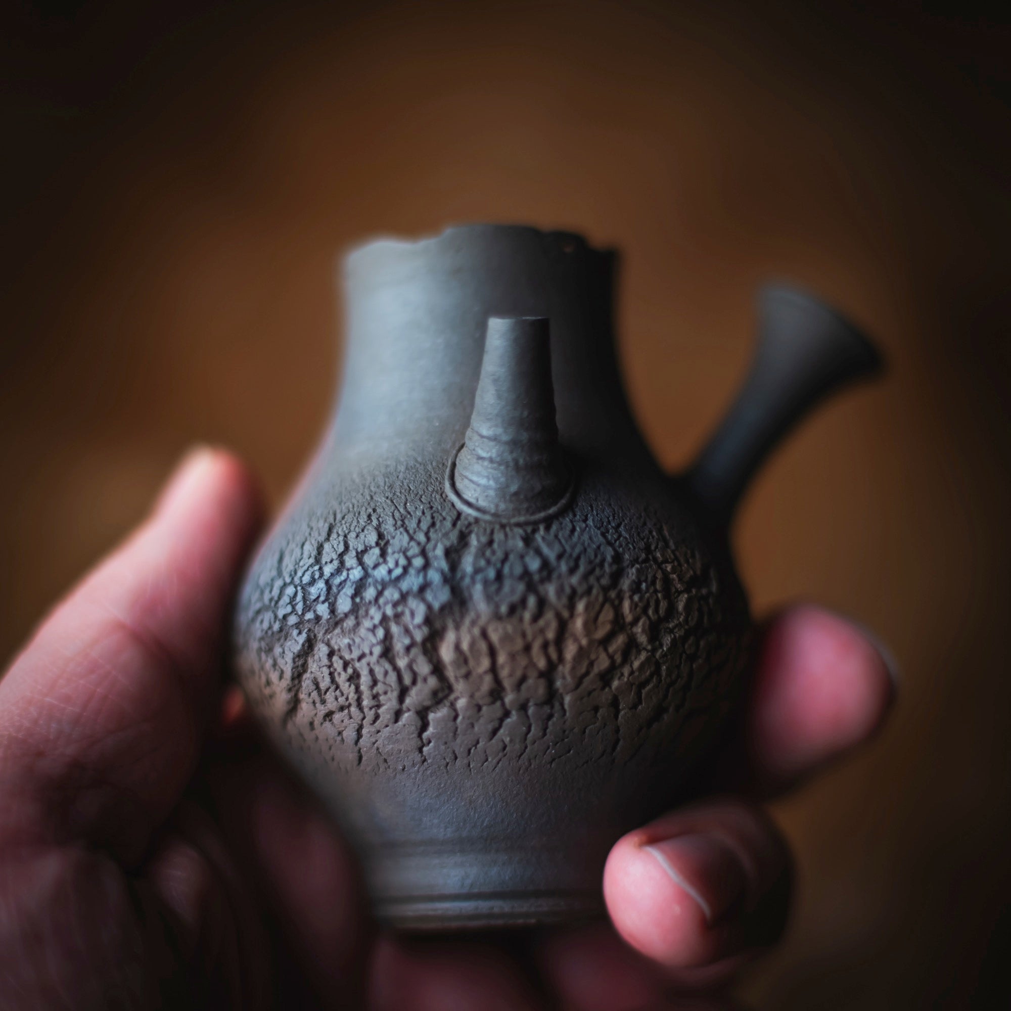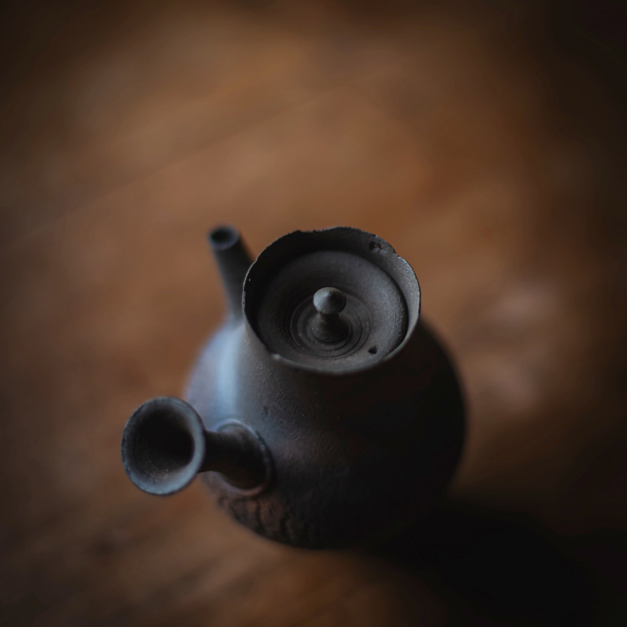 Side-Handle Teapot, wood-fired wild clay, unglazed, single hole filter equipped with removable metal mesh.
